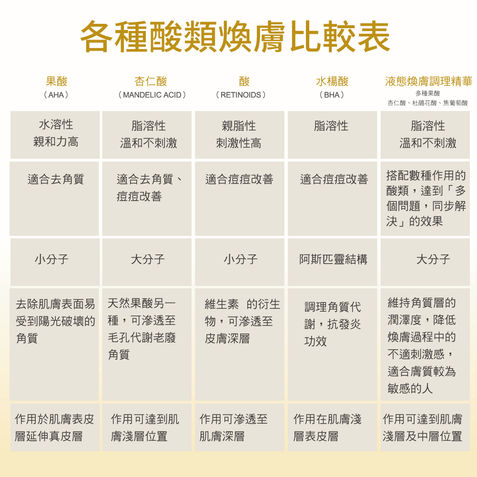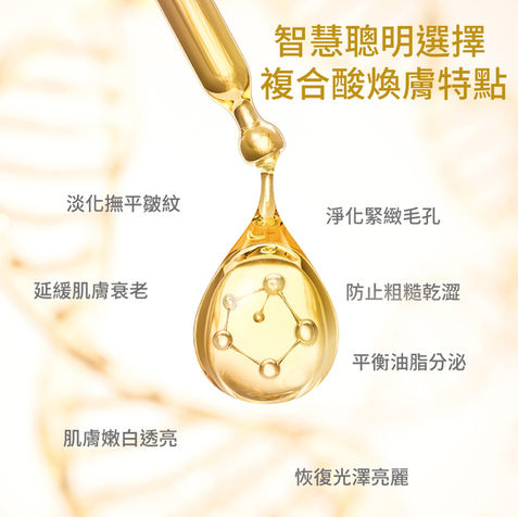 複合酸煥膚以目前的技術已經可以量身訂做,作用進入更深層 的肌膚底層、效果更快速有效。複合酸煥膚即為利用有機酸做淺層或深層的化學性煥膚,並加入多種深層保濕因子,透過表皮更新及真皮重塑,來達到改善皮膚問題與去除老廢角質,後立即讓多種深層保濕因子滲透修復,使肌膚恢復水嫩。